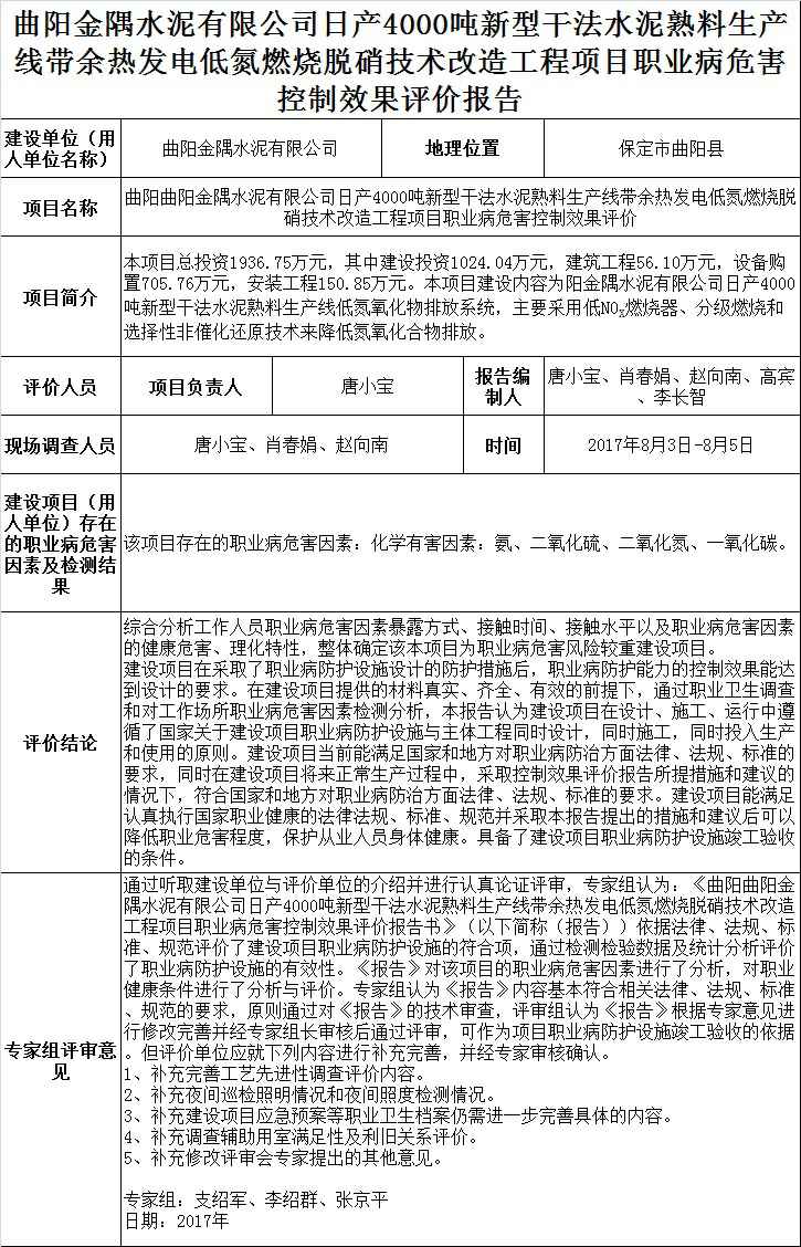 曲阳金隅水泥有限公司日产4000吨新型干法水泥熟料生产线带余热发电项目低氮燃烧烧脱硝技术改造项目职业病危害控制效果评价